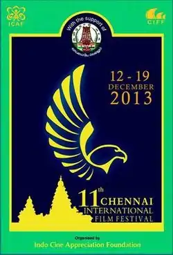 The Chennai International Film Festival (CIFF) was instituted in the year 2003 by the Indo Cine Appreciation Foundation (ICAF), a non-profit organisation.[1] ICAF is a registered film society and works for the promotion of meaningful cinema by organising country centric festivals throughout the year by obtaining films from Embassies and Consulates, and has around 500 members, including film directors, cinematographers and technicians.[2] In 2008, the Government of Tamil Nadu began supporting the event by sponsoring a part of it. The fest was reinvented in 2010 following the involvement of actor-director Suhasini which spiraled the direct involvement of film personalities in coordinating the fest. Later, when the funds raised through well-wishers were not substantial enough to support the event, the state government extended its support and financed the fest with a donation of ₹5 million (US$63,000). Since then, the government has been supporting the subsequent editions of the festival.[1] The fest is conducted every year during the month of December.[3]