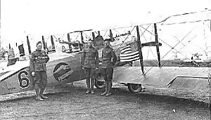 With few exceptions, the 12th’s pilots had never flown combat, but most of the observers had spent a number of weeks flying with French squadrons on active missions. One of these, Lieutenant Stephen W. Thompson, was at the 1st Squadron Gunnery School at Cazaux Airdrome, near Bordeaux when he was loaned on 5 February to the 123d French Breguet Squadron due to a shortage of observers in that unit. Returning from a bombing raid on Saarbrücken, the aircraft in which Lt Thompson was operating the rear guns was attacked by German Albatross pursuit ships. He shot one down, becoming the first man in an American uniform to shoot down an enemy airplane. Later, on 28 July 1918, as a member of the 12th, he was credited with two more "kills."[6]