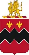 - Shield: The shield is red for Artillery; the black fess dancette (zigzag figure) is taken from the shield of the Coast Defenses of Chesapeake Bay, and is edged in silver, as on the shield of the Coast Defenses of Chesapeake Bay. Two batteries, the 112th Company (Battery A, 60th Artillery, C.A.C.) now Headquarters Battery of this Regiment, and the 158th Company (Headquarters and Service Battery, 1st Anti-Aircraft Battalion), now Battery C of this Regiment, saw service in France. These two batteries are represented by the two fleur-de-lis (lilies).