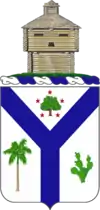 Argent, a pairle Azure between chief an oak tree Proper within a circle of five mullets Gules, a palm tree to dexter and a prickly pear cactus to sinister both of the third.