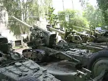 The Br-2 (or possibly B-30) saw combat in the Winter War against Finland, one piece was lost.[2] As of June 1941, the RKKA possessed 37 or 38[3] pieces, of them 24 in the aforementioned heavy artillery regiment and further four in two independent batteries. These batteries were given to the Arkhangelsk military district for use as coastal artillery.[4] The rest of the guns, mainly early production guns with shallow rifling and experimental pieces, remained in storage depots and proving grounds. There is only a fragmentary information of the actual combat use of the Br-2. Some sources mention the guns being used in the Battle of Kursk;[5] the 8th Guards Army employed them in the Battle of the Seelow Heights.[6] By the end of the war, Reserve of the Main Command still had 28 pieces, so apparently none were lost.