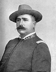 On 25 April 1898, President William McKinley called upon the State to supply two infantry regiments for the Spanish–American War. As none of the regiments were in acceptable condition to deploy – only two companies were determined fit to be mustered into service intact – the decision was made to create two new infantry regiments from the available manpower.[14] The 1st, 2nd, 3rd, and 4th Regiments of Infantry, Arkansas State Guard, were reorganized, redesignated and mustered into federal service between 14 and 25 May 1898 at Little Rock as the 1st and 2nd Arkansas Volunteer Infantry.[14] Governor Jones intended that all sections of the State be represented as far as possible, so the two new Regiments were created from selected State Guard companies and from different sections of the state.[15] Pursuant to the Governor's direction the 1st Arkansas Volunteer Infantry was organized as follows:[16]