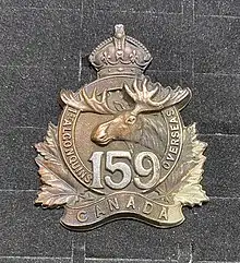 The 159th (1st Algonquins) Battalion, CEF was a unit in the Canadian Expeditionary Force during the First World War. Based in Haileybury, Ontario, the unit began recruiting in late 1915 in the districts of Nipissing and Sudbury. After sailing to England in November 1916, the battalion was absorbed into the 8th Reserve Battalion on January 20, 1917. The 159th (1st Algonquins) Battalion, CEF had one Officer Commanding: Lieut-Col. Ernest Frederick Armstrong.[1]