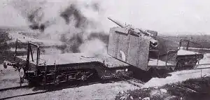 At any rate the 15 cm guns were mounted in a well-base flatcar with two four-wheel bogies. No outriggers were fitted so the recoil energy from shots fired perpendicular to the railroad track could rock the flatcar significantly even with it chained to the ground. They were fitted with front and side gunshields, although, oddly enough, no overhead armor was fitted. They first saw service in 1918 and appear to have been mainly used for coastal defense duties.