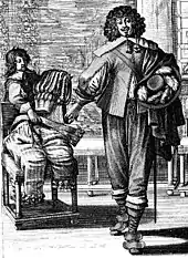 In Protestant and Catholic countries, attempts were made to simplify and reform the extravagances of dress. Louis XIII of France issued sumptuary laws in 1629 and 1633 that prohibited lace, gold trim and lavish embroidery for all but the highest nobility and restricting puffs, slashes and bunches of ribbon.[12] The effects of this reform effort are depicted in a series of popular engravings by Abraham Bosse.[13]