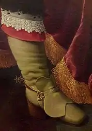 By the 1620s, heeled boots became popular for indoor as well as outdoor wear. The boots themselves were usually turned down below the knee; boot tops became wider until the "bucket-top" boot associated with The Three Musketeers appeared in the 1630s. Spurs straps featured decorative butterfly-shaped spur leathers over the instep.