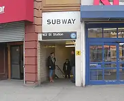 The closed northern half had three exits leading to 163rd Street.[20][21] One exit, which has temporarily been uncovered as an area to haul out debris from renovations, goes to the southeast corner.[22] The other two went to the southwest corner and remain sealed.[19]