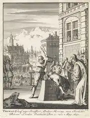 The advancement of the Graces were particularly frustrated during the time that Wentworth was Lord Deputy. On the pretext of checking of land titles to raise revenue, Wentworth confiscated and was going to plant lands in counties Roscommon and Sligo and was planning further plantations in counties Galway and Kilkenny directed mainly at the Anglo-Irish Catholic families.[13] In the judgement of historian Pádraig Lenihan, "It is likely that he [Wentworth] would have eventually encountered armed resistance from Catholic landowners" if he had pursued these policies further.[14] However, the actual rebellion followed the destabilisation of English and Scottish politics and the weakened position of the king in 1640. Wentworth was executed in London in May 1641.