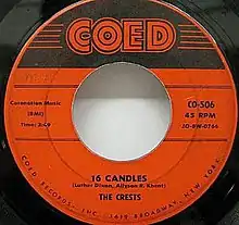 "16 Candles" is a 1958 song performed by The Crests and written by Luther Dixon and Allyson R. Khent.