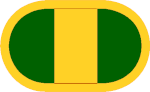 - A gold insignia consisting of a diagonal band divided throughout by a radiant partition line gold and scarlet, all within a green annulet, the upper part inscribed with the motto 'Combat Support' in gold letters and the lower part surmounted by two gold sprigs of oak leaves; overall an upright white sword.
