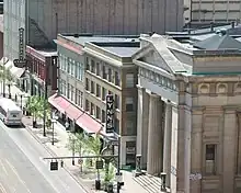 171-191 South High Street is a pair of historic buildings located between Walnut and Town Streets, west of High Street in Downtown Columbus. The structures stand across from the Columbus Commons park.[1] The buildings are eligible for listing in national, state, and local historic registers. The pair of early 20th century commercial structures are now rare in Downtown Columbus. While South High Street in the city's downtown district was once lined with innumerous early 20th century retail facades, the buildings at 171, 191, and 195 South High are the only remaining structures of this type. 195-201 South High has been significantly altered by the removal of its upper two stories, likely after a major fire in 1946.[2] While 171 South High is believed to be a 19th-century building, its facade dates to the early 20th century, adding to a street view that has remained largely unchanged for well over 100 years. The low-rise buildings fill their rectangular sites, abutting the sidewalk on High Street, originally with floor-to-ceiling windows to advertise goods for sale. These storefronts have been altered, likely numerous times, since their construction. Both buildings are of unreinforced masonry construction with wood-frame interior structures. Their exteriors are adorned with signs and awnings, not original to their designs.[3]