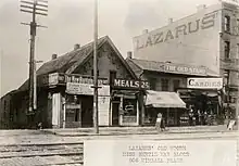 171-177 S. High Street, known as the Old Lazarus Block, was constructed in the 19th century. In 1858, five-term Columbus mayor George J. Karb was born on the building's third floor. The building was remodeled sometime between 1911 and 1915.[6][7] In the 1880s, Pfaff & Co. operated at this address, selling gas fixtures, glass, and queensware. In the 1890s, the Columbus Optical Company and Mme. King's, selling hats and bonnets, operated at this address. Columbus Optical Co. was re-established in 1940, operating at 177 or 191 South High from 1965 into 1982, when it was renamed Tuckerman Optical;[8][9][10][11] the brand was almost entirely bought out by LensCrafters in 1994.[12] In 1895, the F. & R. Lazarus Company constructed a large clocktower on top of the building. The Italian Renaissance Revival-style tower reportedly would increase the building's height to 100 feet, and carry 600 electric lights, along with a 1,000-lb. fire bell connected to the city fire department. The clocktower's plans were by the firm of C. A. Stribling, best known for his work in the firm Stribling & Lum, prominent in Central Ohio.[13][14] Upon installation, the building and its clocktower were heavily adorned with lightbulbs. Together with the electric-lit streetcar arches on High Street, the block became a "miniature white way" every night at that time.[15] In 1909, the Early Motor Car Co. opened in the building.[16] In August 1910, a neighboring building, part of the seven-building Lazarus complex, was torn down for construction of the Ohio National Bank.[17] A few months earlier, Lazarus's clocktower was also demolished. The tower was beloved by locals, and relied on by businesspeople in the area.[18] In 1920, the Republican state headquarters moved into the building, still known as the old Lazarus building.[19] In the 1920s, Korn Hatters operated in the building,[20] and from 1915 to at least 1923, Eddie Gettrost ran a bowling alley, the South High Alleys, in the building.[6][21] There the Columbus Women's Bowling Association held its first city tournament, in 1922, and continued nearly every year into the 1940s.[22]