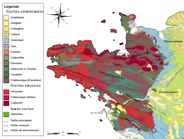 The collision between the Aquitaine and Armorican tectonic plates gave birth in the Carboniferous era to the Hercynian basement of the Armorican massif creating faults oriented north-west, south-east, which go from the Pointe du Raz to Nantes and the Landes de Lanvaux to Angers and extend south of the Loire estuary. These shear fractures are at the origin of grabens which are accentuated during the Mesozoic and the Cenozoic, and fill up with sediments that may be more than 100 m thick in the deepest ditches. They are still active in the Quaternary and their replay explains the earthquakes of the south of the Loire and more particularly those of the Vendée.[10][11]