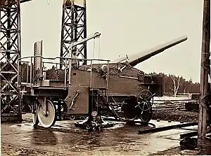 When the pre-dreadnoughts began to be relegated to training duties in 1916.[3] The guns were adapted for land use by mounting it on an improvised carriage, but this proved to be extremely heavy, often too heavy to be moved by horse, even after being broken down into three loads. The solution was to mount the guns, still on their carriages, on rail cars to increase their strategic mobility.[4]