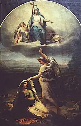 The clashes between liberals and conservatives eventually produced the Wallachian Revolution of 1848. It is depicted by the conservative Lăcusteanu as one "of the petty schoolteachers, the lawyers, the rapacious upstarts [and] the boyar sons", the urban masses having been incensed by both Duhamel and the deposed ruler Ghica.[100] Initially welcoming the radicals, Bibescu abdicated under street pressure, then fled to safety in Austria.[101] The uprising had a set of republican ideals, with a democratized elective monarchy—goals expressed in the Proclamation of Islaz.[102] However, it did not effect complete institutional changes, only establishing a Revolutionary Government that included, in its earliest stages, Bibescu's rival Câmpineanu as Caimacam.[74] This collective leadership was eventually brought down by an Ottoman–Russian invasion, co-led by Mehmed Fuad Pasha, Abdülkerim Nadir Pasha, and Alexander von Lüders, with the only battle being fought over Dealul Spirii.[103]