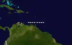 A hurricane with winds of 80 mph (130 km/h) was initially observed about 750 miles (1,210 km) northwest of the coast of Venezuela on August 13. The cyclone tracked due westward and crossed Grenada, before entering the eastern Caribbean. Heavy rain and squalls were reported in Barbados and Grenada. This system was last noted near La Orchila, Venezuela on August 14.[2][1]