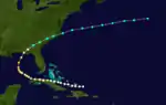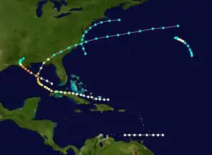A hurricane formed north of Hispaniola on August 25. It moved westward, passing over the Inagua Islands before striking the north coast of Cuba as a Category 2 hurricane on August 27. The cyclone weakened to Category 1 strength as it crossed the island, close to Matanzas, but regained first Category 2 and then Category 3 strength as it moved north through the Gulf of Mexico. The cyclone made landfall near Panama City, Florida, on August 31 as a Category 2 hurricane. Thereafter, it then quickly weakened to a tropical storm while moving northward through Georgia and South Carolina. The storm entered the Atlantic from the state of Virginia on next day and dissipated on September 3.[2]
