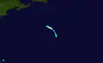A sixth tropical storm was first observed by the brig Caroline E. Kelly on September 18, which experienced a heavy gale while located about 930 miles (1,500 km) east-southeast of Bermuda.[1] With initial winds of 60 mph (97 km/h), the storm slowly strengthened while moving north-northwestward. At 1200 UTC on September 19, it reached hurricane status and peaked with winds of 80 mph (130 km/h). The storm decelerated and remained at this intensity for over 24 hours. Late on September 21, the system re-curved westward and weakened to a tropical storm.[2] It was last seen by the Pride of the Sea on September 22,[1] while located about 695 miles (1,118 km) south of Cape Race, Newfoundland.[2]