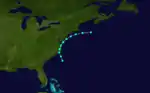 The third tropical storm of the season developed on August 19 about 170 miles (270 km) southeast of Cape Fear, North Carolina. At 1100 UTC that day, it made landfall near Cape Lookout with winds of 60 mph (97 km/h). The storm traveled north and emerged into the Chesapeake Bay near Norfolk, Virginia. The storm continued travelling northward just offshore of the east coast of the US before finally dissipating off Rhode Island on August 21.[2] Heavy rains and strong winds were reported in Connecticut, Massachusetts, New York, and Washington, D.C. This system was known as the Charter Oak Storm, because it felled the famed Charter Oak in Hartford, Connecticut.[9]