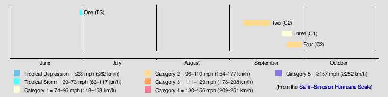 The season's activity was reflected with a low accumulated cyclone energy (ACE) rating of 43. ACE is, broadly speaking, a measure of the power of the hurricane multiplied by the length of time it existed, so storms that last a long time, as well as particularly strong hurricanes, have high ACEs. It is only calculated at six-hour increments in which tropical and subtropical systems are either at or above sustained wind speeds of 39 mph (63 km/h), which is the threshold for tropical storm intensity.[1]