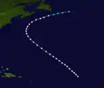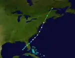 On September 17, a hurricane was observed in the mid-Atlantic by the bark Phantom. Later that day, the Phantom sank, though all of the crew survived. They described the system as a 'perfect hurricane' with a lull around midnight on September 17 before the wind changed direction and blew with even greater force than before. The hurricane continued travelling on a northwest track and between September 22 and the night of September 23 it was encountered by the Hudson, the City of Washington and the bark Lanark.[3] The system weakened to a tropical storm early on September 24 and dissipated later that day about 610 mi (980 km) east of Cape Race, Newfoundland.[4] Until reanalysis, this storm was considered two separate systems, including in the 1995 study by Partagas and Diaz. However, they stated that further information could indicate a single storm.[3]