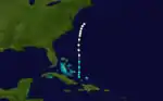 The bark Cavallo encountered experienced severe weather in the eastern Gulf of Mexico between September 13 and September 15. It is believed that a tropical storm developed on September 14.[3] Moving northeastward, the storm made landfall near modern-day Palmetto, Florida at 15:00 UTC, with winds of 70 mph (110 km/h).[4] While crossing the state, the storm brought severe damage. Ships remained in port at river ports in the state and at St. Marys, Georgia.[3] After emerging into the Atlantic Ocean near Oak Hill, Florida early on September 15, the system reached hurricane status several hours later. Shortly thereafter, the storm intensified into a Category 2 hurricane, peaking with winds of 105 mph (165 km/h). On September 16, the hurricane passed offshore North Carolina and then weakened to a Category 1 hurricane while east of the Mid-Atlantic states.[4]