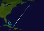 Based on reports from the bark Wh H. Chandler, a tropical storm developed in the Bahamas near Acklins on September 22.[3][4] Moving northward, the storm strengthened into a Category 1 hurricane by 12:00 UTC the next day.[4] Later on September 23, the Harkaway noted a "severe hurricane" at Bermuda, though the report was considered "doubtful" due to the storm's distance from the island.[3] The hurricane continued northward and was last noted about 200 mi (320 km) east of Virginia on September 25, after the Priscilla observed sustained winds of 90 mph (150 km/h).[4]