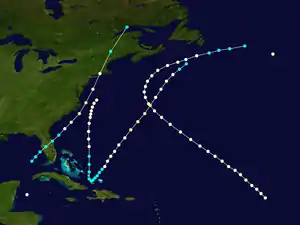 The final known tropical cyclone of the season was first observed by the brig Sea Lark on October 21,[3] while located just north of Inagua in the Bahamas.[4] Throughout the Bahamas, storm surge impacted some islands. At Nassau, several ships were driven ashore, parts of the town were flooded and buildings along the shoreline suffered damage.[3] The storm moved northeastward and strengthened into a hurricane at 12:00 UTC on October 22. About 24 hours later, the hurricane deepened into a Category 2 hurricane. Later on October 23, it passed just west of Bermuda.[4] Gale force winds and rough seas were observed on the island, causing damage to several vessels.[6] Peaking with winds of 105 mph (165 km/h), the storm began to weaken, falling to Category 1 intensity on October 25. It weakened to a tropical storm early the following day and dissipated hours later, while located about 195 mi (315 km) east-southeast of Sable Island.[4]