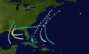 The first known storm of the season—which would also become the strongest—is listed in the hurricane database as having formed on August 8 in the eastern Gulf of Mexico, just offshore the west coast of the Florida peninsula, although it is possible the hurricane was related to a heavy gale encountered by a ship on August 5 during its voyage from Havana, Cuba to New York City. The cyclone drifted southwest for three days, gradually intensifying to attain a strength corresponding to Category 4 major hurricane status on the modern-day Saffir-Simpson Hurricane Scale. Beginning on August 11, the hurricane slowly curved to the north, then gained an easterly component to its movement, and was at its peak intensity with maximum sustained winds of 130 mph (210 km/h) about midday.[1][4]