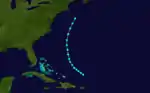 Over a week after the dissipation of the first system, another tropical storm formed to the east of Florida on August 23. The storm tracked generally northeastward, roughly paralleling the East Coast of the United States as it peaked with sustained winds of 105 mph (169 km/h) on August 25. These winds would have made it a Category 2 hurricane on the Saffir-Simpson Hurricane Scale. Continuing in the same general direction, the hurricane began to weaken shortly after attaining peak intensity, and the last official data point for the storm places it east of New England on August 26.[1] The hurricane was undetected until modern-day reanalysis reconstructed its path based on reports from ships in the area. On August 24, the vessel Mary Rusell encountered the storm and sustained some damage. A day later, a heavy southeasterly gale left the vessel Rocius in a "sinking condition"; her captain and crew were rescued by the crew of the Zurich.[8]