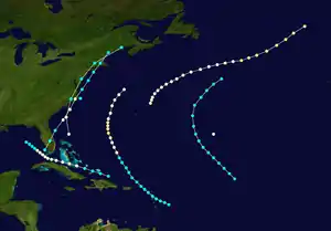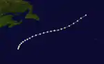 The first tropical cyclone and hurricane of the 1861 season is believed to have formed on July 6, immediately east of the Leeward Islands. A 1938 publication documented the storm's effects on Guadeloupe and St. Kitts, and given a lack of prior reports on the cyclone, modern-day reassessments concluded that it was relatively weak when it affected those islands.[5] After crossing the northern Leeward Islands, the tropical storm broadly curved toward the northwest, likely intensifying into the equivalence of a Category 1 hurricane on the Saffir-Simpson Hurricane Scale on July 9.[2] The majority of the storm's track in the western Atlantic was unknown until it was reconstructed based on reports from, and the effects on, three ships in its vicinity.[5]