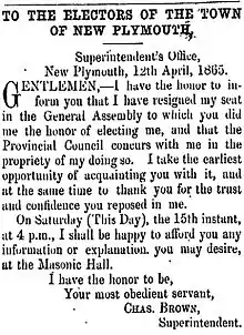 Brown resigned from the House of Representatives on 12 April 1865, and informed the electors via an advertisement in the next edition of the Taranaki Herald of his decision. The advertisement called for a meeting on the day of its publication where Brown would outline his reasons for resigning.[3] Due to the short notice, only ten electors came and the meeting was postponed by a week.[4]