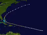 On September 18 and for two days subsequently, a barque sailed through a hurricane near the Cape Verde islands. The vessel was en route from New York to Shanghai, but due to a leak from the storm it had to return to New York for repairs.[2] Aside from a single reported location, the track of the hurricane is unknown. Winds were estimated around 80 mph (130 km/h).[1]