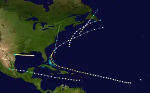 The final storm of the season was first observed on October 28 over the Bahamas, and may have been a hybrid or subtropical cyclone. It moved north-northwestward through the island chain, followed by a turn to the north-northeast over the western Atlantic. Several ships encountered the tropical storm, and one lost their supply of molasses.[2] On October 30, the cyclone, at the time transitioning to extratropical, struck on the southern end of Long Beach Island with winds of 70 mph (110 km/h).[9] As it moved through the northeastern United States, the storm dropped heavy rainfall, causing flooding near Jersey City and Hoboken, New Jersey. In Brooklyn, the storm moved the rail cars off their tracks, while in Providence, Rhode Island the winds destroyed three buildings and wrecked the roofs of two others. Further northeast, the storm disrupted shipping and cut telegraph lines, although no fatalities were reported. The post-tropical storm was last observed over Vermont late on October 30.[2]
