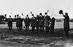 William J. Leggett, later a distinguished clergyman of the Dutch Reformed Church, was the Rutgers captain; William Gummere, who later became chief justice of the Supreme Court of New Jersey, captained the New Jersey squad.[9] The game was played in front of approximately 100 spectators.[12] The players from Rutgers wore scarlet-colored turbans and handkerchiefs to distinguish themselves from the Princeton players. The scarlet of the Rutgers Scarlet Knights came from this episode.[13]