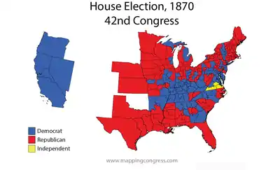 The 1870 United States elections occurred in the middle of Republican President Ulysses S. Grant's first term, during the Third Party System. Members of the 42nd United States Congress were chosen in this election. The election took place during the Reconstruction Era, and many Southerners were barred from voting. It was also the first election after the passage of the 15th Amendment, which prohibits state and federal governments from denying the right to vote on the basis of race, color, or previous condition of servitude, although disenfranchisement would persist. The Republican Party maintained a majority in both houses of Congress, although Democrats picked up several seats in both chambers.