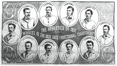 With the debut of the first professional baseball league, the National Association of Professional Base Ball Players, the Athletic Baseball Club of Philadelphia was one of the first clubs to join. The Athletics had been around since 1860 as an amateur club. Led by their captain and pitcher, Dick McBride, the team went 21–7 and won the first NA title during the 1871 season. Philadelphia's third baseman, Levi Meyerle, led the league with a .492 batting average.