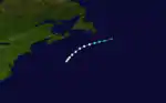 A hurricane was discovered located roughly halfway between Bermuda and Nova Scotia on September 9. The hurricane did not strengthen and began to gradually weaken as it moved to the south of Newfoundland. It weakened to a tropical storm and later became extratropical on September 11.[4]