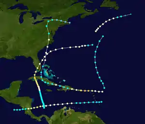 A tropical storm was discovered north of Panama on October 12. It moved very slowly and generally northward. It became a hurricane early on October 17 and passed just east of Grand Cayman, where significant effects were reported.[9] It attained a peak intensity of 115 mph (185 km/h) just before making landfall on Bejucal in western Cuba, where the barometer dropped as low as 28.32 inches of mercury (959 mb) on October 19.[10] The calm center of the storm passed over the capital Havana and then entered the Straits of Florida.[2] Just before 00 UTC on October 20, the eye of the cyclone struck Key West, Florida, which reported atmospheric pressure of 28.73 inHg (973 mb) and wind of 111 mph (179 km/h) veering to the southwest.[2] About six hours later, early on October 20, the eye made landfall on the Florida mainland near Chokoloskee with winds of 105 mph (169 km/h). Emerging into the Atlantic near Sebastian around 12 UTC, it produced a pressure of 28.82 inHg (976 mb) at Cape Canaveral.[2] The cyclone later passed north of Bermuda before dissipating on October 23. Bermuda recorded gale-force winds and a pressure of 29.30 inHg (992 mb).[4]
