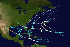 The 1880 Atlantic hurricane season ran through the summer and fall of 1880. This is the period of each year when most tropical cyclones form in the Atlantic basin. In the 1880 Atlantic season there were two tropical storms, seven hurricanes, and two major hurricanes (Category 3+). However, in the absence of modern satellite and other remote-sensing technologies, only storms that affected populated land areas or encountered ships at sea were recorded, so the actual total could be higher. An undercount bias of zero to six tropical cyclones per year between 1851 and 1885 and zero to four per year between 1886 and 1910 has been estimated.[1] Of the known 1880 cyclones, Hurricane Six was first documented in 1995 by José Fernández-Partagás and Henry Díaz. They also proposed large changes to the known tracks of several other storms for this year and 're-instated' Hurricane Ten to the database.[2] A preliminary reanalysis by Michael Chenoweth, published in 2014, found thirteen storms, nine hurricanes, and four major hurricanes.[3]