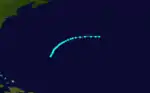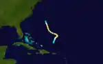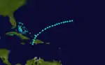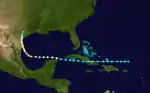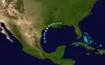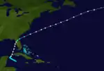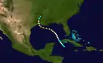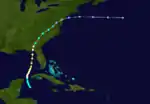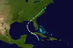 Little more than a day after the dissipation of the previous hurricane, a broad area of low pressure over the western Caribbean Sea developed into a tropical storm while centered about 180 miles (290 km) east-southeast of Punta Allen, Quintana Roo, Mexico.[4][12] Over the next two days, the storm meandered toward and through the Yucatán Channel, gradually intensifying as it proceeded to the north-northwest and north. Late on June 18, the system attained hurricane status off the western tip of Pinar del Río Province, Cuba. The following day, the cyclone turned to the north-northeast, producing "severe gales" (47–54 mph, 76–87 km/h) over the waters off Cuba and Jamaica, as reported by ships.[14] At 00:00 UTC on June 20, the storm reached its peak intensity of 100 mph (160 km/h), and shortly afterward its forward speed accelerated. At 11:00 UTC on June 21, the cyclone made landfall a short distance east of St. Marks, Florida, as a Category 2 hurricane.[4] The storm gradually decreased in intensity over the next day and a half as it crossed the Southeastern and Mid-Atlantic states. By 18:00 UTC on June 23, the system passed about 70 miles (110 km) southeast of New York City and curved to the east before dissipating a day later.[4]