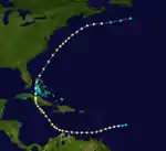 On August 15 a hurricane was seen 90 miles northeast of Barbados. On August 16 it passed over the island of Saint Vincent as Category 2 hurricane. The hurricane passed north of Grenada and continued westward towards the coast of Venezuela, bringing a heavy gale, and some damage, to Curaçao before curving north. Around midnight on August 19 it hit Jamaica, still at Category 2 intensity. The island experienced winds of 110 mph (180 km/h) throughout August 19 and 20th. The hurricane approached the south coast of Cuba as a major Category 3 hurricane on August 21. It crossed Cuba over the central province of Ciego de Ávila before exiting the island near Moron on the north coast. The hurricane then passed over Nassau on the night of August 22. It quickly moved northeastward, and travelled parallel to the east coast of the United States, still at Category 2 intensity, before it weakened and dissipated south of Newfoundland on the August 27.[3] Damage was extensive at several of the locations impacted by the hurricane and some fatalities occurred on St. Vincent, Jamaica and possibly Cuba. Throughout the south of St Vincent, damage was extensive with many injuries and some fatalities reported. Thousands of trees were blown down and 300 homes destroyed on the island. At Jamaica crops and plantations were destroyed and some ships wrecked in Kingston harbour. In Cuba hundreds of homes were blown down, many trees were uprooted and some areas flooded. In the Bahamas, several sailing ships were blown ashore, both at Nassau and at Andros and at the Berry Islands.[3]