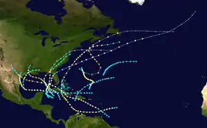 The 1886 Atlantic hurricane season ran through the early summer and the first half of fall in 1886. This is the period of each year when most tropical cyclones form in the Atlantic basin. It was a very active year, with ten hurricanes, six of which struck the United States,[1] an event that would not occur again until 1985 and 2020. Four hurricanes became major hurricanes (Category 3+). However, in the absence of modern satellite and other remote-sensing technologies, only storms that affected populated land areas or encountered ships at sea are known, so the actual total could be higher. An undercount bias of zero to six tropical cyclones per year between 1851 and 1885 and zero to four per year between 1886 and 1910 has been estimated.[2] Of the known 1886 cyclones, Hurricane Seven and Tropical Storm Eleven were first documented in 1996 by Jose Fernandez-Partagas and Henry Diaz. They also proposed large alterations to the known tracks of several other 1886 storms.[3]