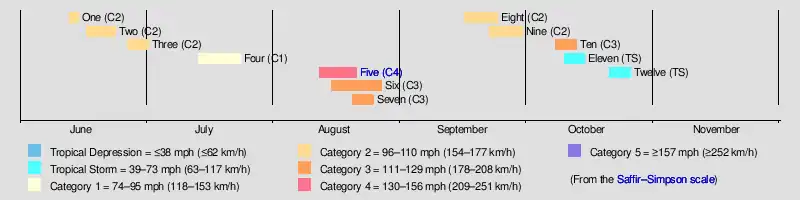 Although other storms may have gone undetected, tropical activity definitely began by the middle of June with the formation of the first named storm over the western Gulf of Mexico on June 13. Two other storms formed before the end of the month and also reached the Gulf of Mexico. The first three storms of the season each attained hurricane intensity and eventually made landfall on the U.S. Gulf Coast with winds of 100 mph (160 km/h).[4] A mid-July storm that formed over the western Caribbean moved northward and struck the west coast of Florida as a hurricane, after two earlier, stronger storms had already done so. Never before or since have so many hurricanes struck Florida in the same season before the month of August.[11] Three storms, all of which attained major hurricane intensity, formed in close succession, over a span of eight days, in August. The first of these, the Indianola hurricane, was the strongest and most intense tropical cyclone of the season, striking multiple islands in the Greater Antilles before rapidly strengthening over the western Gulf of Mexico. It struck the U.S. state of Texas on August 20 with winds of 150 mph (240 km/h), making it one of the strongest hurricanes on record to hit the state.[10] September was a less active month than August, featuring two hurricanes on and just after mid-month. The final hurricane of the year formed in early October and struck Louisiana with winds of 120 mph (190 km/h). Two additional tropical storms occurred in October, with no further activity confirmed afterward.[4]