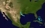 The second tropical storm of the season originated about 200 mi (322 km) east of the mouth of the Rio Grande, on the Texas–Mexico border. It moved north-northwest, attaining its peak intensity of 60 mph (97 km/h) by 00:00 UTC on July 5. About 16 hours later, the moderate tropical storm made landfall at that intensity just east of Bay City—impacting the same region as the previous storm. The cyclone turned north and north-northeast after striking land, slowly weakening as it did so. By 12:00 UTC on July 6, the cyclone was last positioned over northwestern Cherokee County, Texas.[2]