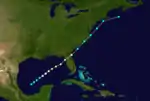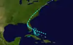 Moving west-northwestward, the tropical storm steadily intensified into a hurricane 24 hours later on August 15. It made landfall on Cat Island in The Bahamas, which were then a British crown colony and overseas territory. Continuing to intensify, the hurricane passed just 20 mi (32 km) south of the Bahamian capital Nassau, on New Providence Island, around 00:00 UTC on August 16 with winds of 105 mph (169 km/h). The cyclone, continuing to the west-northwest, then made another landfall on the northern end of Andros Island. As it neared the southeast coast of Florida, it strengthened into the equivalence of a major hurricane—Category 3 on the Saffir–Simpson hurricane wind scale—and attained peak winds of 125 mph (201 km/h), near the upper threshold of Category 3 intensity, by 12:00 UTC on August 16. About seven hours later, it made landfall just north of present-day Miami Beach at peak intensity. (This location was near present-day Upper Eastside in Miami.) The cyclone weakened as it moved inland over the Everglades, south of Lake Okeechobee, and by 06:00 UTC on August 17 passed out into the Gulf of Mexico near Matlacha and Cayo Costa. By that time maximum sustained winds had decreased to 80 mph (129 km/h). By 18:00 UTC on August 17, however, the cyclone regained intensity, and its path turned westward over the Gulf of Mexico. Early on August 18, the hurricane attained a second peak intensity of 110 mph (177 km/h). In the time before landfall in Louisiana, its path gradually bent to the northwest and north-northwest. Around 16:00 UTC on August 19, the cyclone made landfall south of Cocodrie, Louisiana, as the equivalence of a strong Category 2 hurricane. Turning northward after moving inland, the hurricane weakened to a strong tropical storm by 18:00 UTC on August 20, its path nearing Greenville, Mississippi, before curving to the northeast. Little more than a day later, it passed over southern New England, becoming extratropical by 12:00 UTC on August 22.[2]