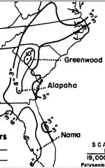 As it passed over The Bahamas, the hurricane caused damage to fruit trees, crops, and fences, especially on the Abaco Islands, Harbour Island, and New Providence. Winds shifted from northeast and southwest, lasting about eight hours, but damage to shipping was minimal.[12] In South Florida, the hurricane struck a sparsely-populated section of the coast, but still produced widespread damage[13] as far north as Sebastian. The highest wind reported in South Florida was 60 mph (97 km/h) at Jupiter,[14] and the heaviest rainfall was 2.02 in (51 mm) at that location.[11] Farther north along the coast, winds at Sebastian Inlet were estimated at 75 mph (121 km/h), downing trees and telegraph poles; many small boats were pushed ashore, and "several thousand dollars" in damage were reported to local fruit groves.[13][15] Additionally, the hurricane reportedly produced a storm surge of 14 feet (4.3 m) "on the beaches near Miami."[13] In the Big Bend region of Florida, winds at Cedar Key reached 42 mph (68 km/h), accompanied by light rain, and caused several yachts to capsize.[15] Winds at Pensacola, in the Florida Panhandle, peaked at 60 mph (97 km/h), badly damaging local property.[15] Winds in Mobile, Alabama, peaked at 55 mph (89 km/h),[11] prostrating trees and fences, and a few homes lost their roofs.[16] Flooding from the storm surge was among the worst on record: the waterfront was flooded to a depth of 3 ft (0.91 m),[15] with floodwater extending two to three blocks inland from the Mobile River.[16] Along the Mississippi River Delta, the storm produced severe flooding.[13] Rainfall in New Orleans totaled 7.9 in (201 mm) over a 12-hour period, and winds in the city reached an estimated 90 mph (145 km/h);[11] in the city strong winds unroofed many buildings, downed numerous trees, and blew down fences. In many areas, strong winds downed at least one-third of the timber, and damage to rice, sugarcane, corn, and cotton crops was significant.[15][16] The lowest reported pressure in the Mississippi Delta was 29.37 inHg (995 mb) at Vicksburg, Mississippi, with other readings as low as 29.4 inHg (996 mb) in the Memphis area.[14] The storm produced heavy rainfall and high winds along much of its path across the Mississippi Valley, the Mid-Atlantic states, and the Northeastern United States.[11]