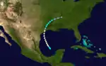 A tropical storm formed in the Gulf of Mexico northwest of Campeche on 3 July. By the evening of 6 July it was approaching the coastline of Texas and had become a Category 1 hurricane. It made landfall just west of Galveston and quickly weakened to a tropical storm. It dissipated near the Alabama-Tennessee state line two days later after further weakening to a tropical depression.[4] Sections of Galveston were flooded by a storm surge.[5] At Baton Rouge, tornadoes related to the hurricane demolished one hundred homes and caused two floors of the state penitentiary to collapse, killing ten prisoners.[2]