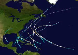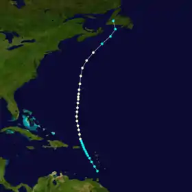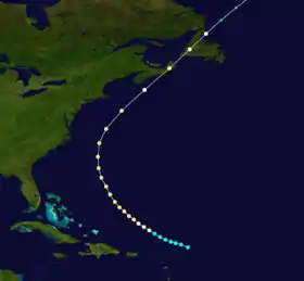 A tropical storm formed in the open Atlantic near 21°N 54°W on 29 September. It moved northwestward becoming first a Category 1 hurricane then, on 3 October, a Category 2 hurricane. At this strength it passed to the south then to the west of Bermuda on 4 October. It quickly weakened as it continued heading north and was already an extratropical storm when it made landfall in Nova Scotia on 6 October. It also struck Newfoundland before dissipating in the Labrador Sea on 8 October.[4]