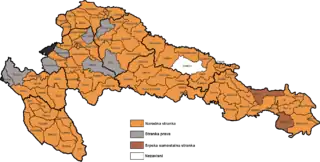 ![]() Results of the election in each of the electoral districts in 8 counties of the Kingdom of Croatia-Slavonia: the party with the plurality of votes in each district: People's Party Party of Rights Serb Independent Party Independent | |||||||||||||